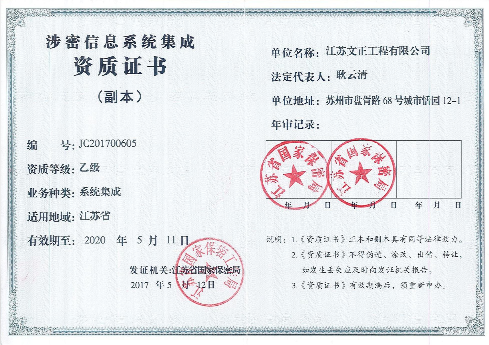 涉密信息系統(tǒng)集成資質(zhì)證書乙級